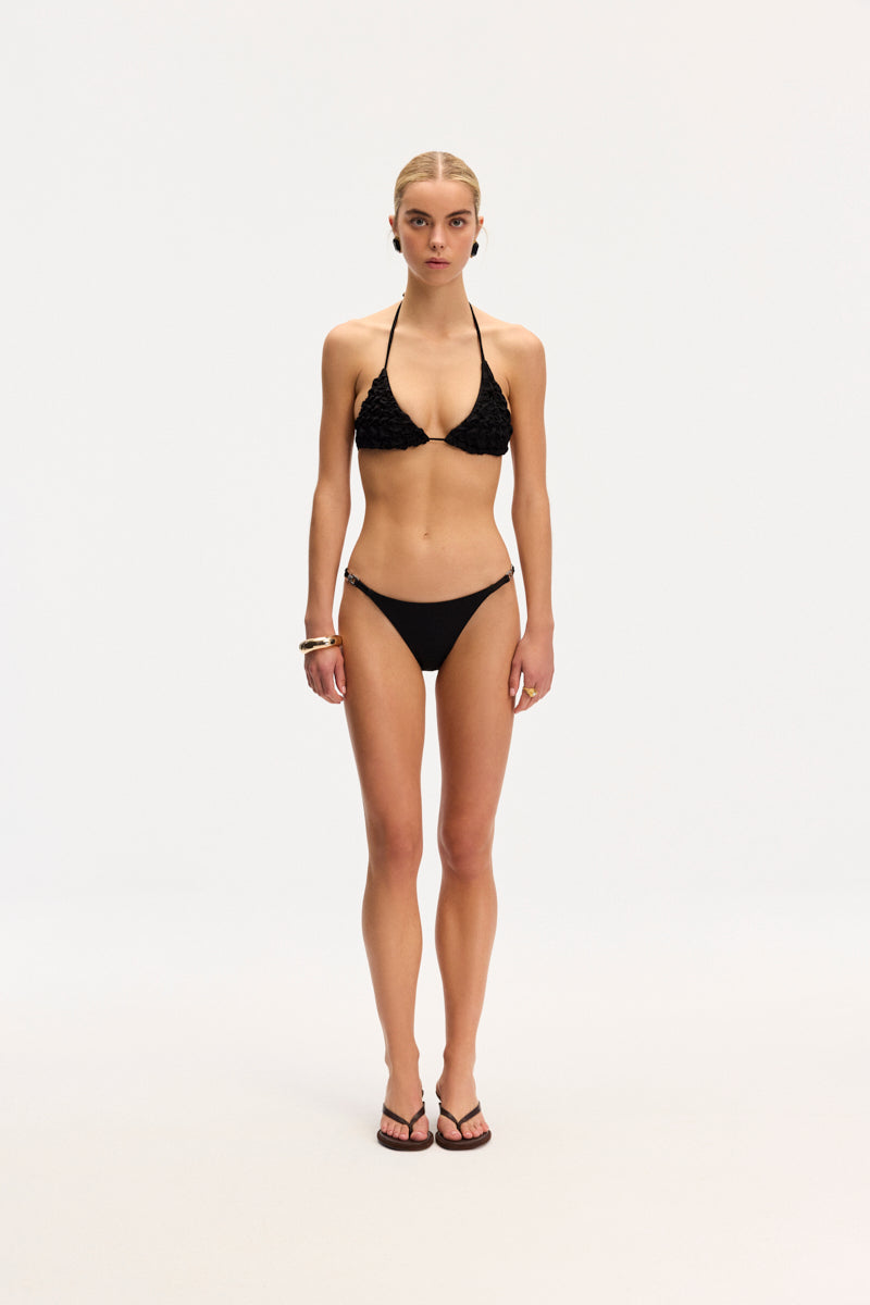 The Lia black bikini top is a crafted from shirring fabric for a luxurious drape. Coordinate effortlessly with the matching bikini bottom and mini skirt for seamless transitions from beach to boardwalk. Unpadded cups for excellent coverage, halter style and back self-tie closures.